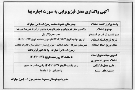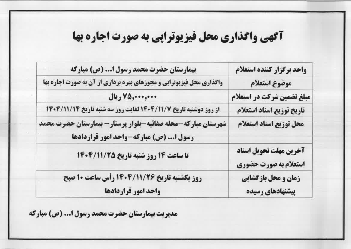 اگهی واگذاری محل فیزیوتراپی به صورت اجاره بها